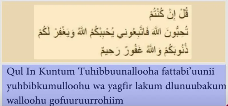 قُلْ إِنْ كُنْتُمْ تُحِبُّونَ اللَّهَ فَاتَّبِعُونِي يُحْبِبْكُمُ اللَّهُ وَيَغْفِرْ لَكُمْ ذُنُوبَكُمْ وَاللَّهُ غَفُورٌ رَحِيمٌْ