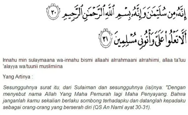 Artinya: Surat ini dari seorang yang bernama Sulaiman, ia mengawalinya dengan menyebut nama Allah, Yang Maha Pengasih lagi Maha Penyayang isi jangan memujiku, tetapi datanglah kepadaku sebagai orang yang berserah diri.