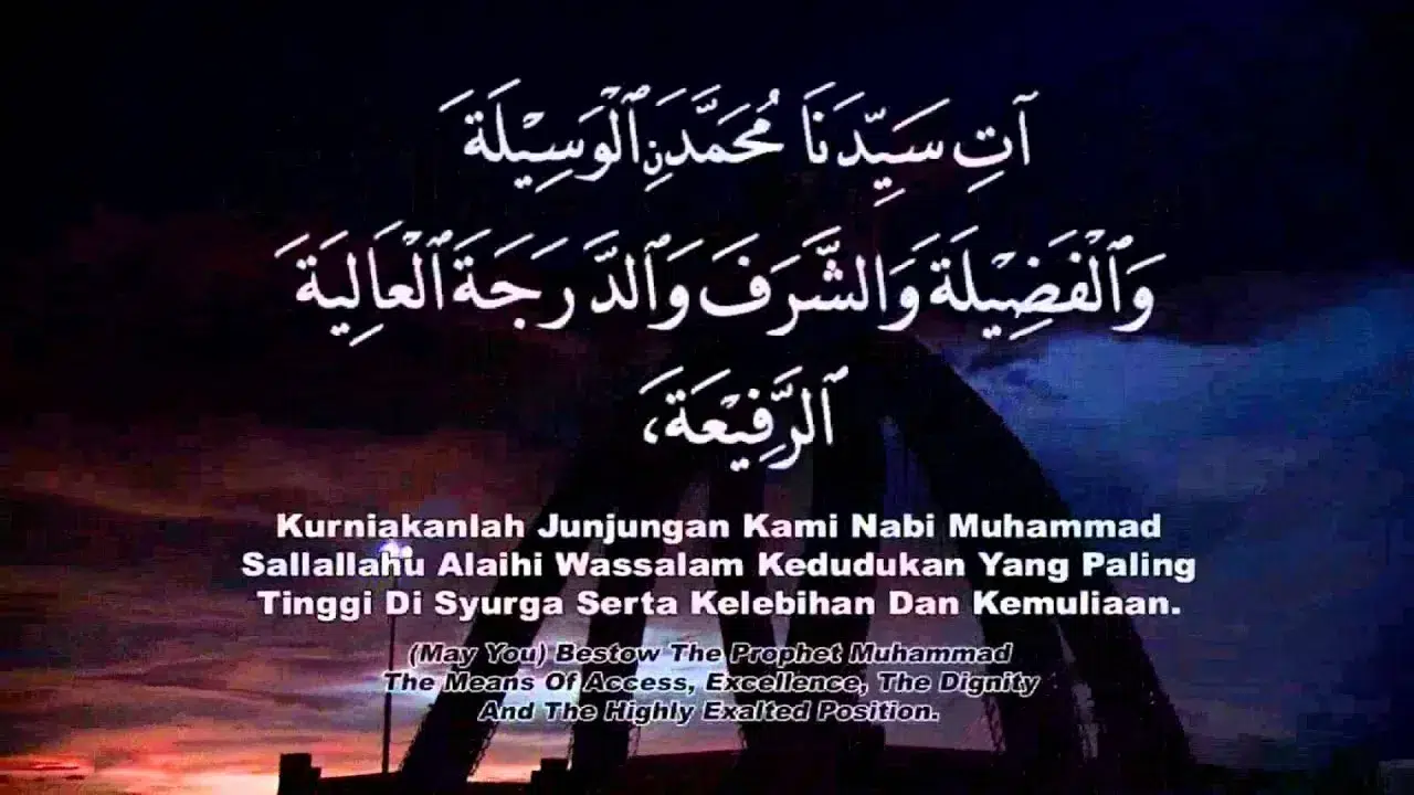 Maksudnya: Ya Allah, Tuhan yang memiliki panggilan yang sempurna ini dan solat yang akan didirikan, berikanlah kepada Muhammad kedudukan yang tinggi dan kelebihan. Dan bangkitkanlah dia pada kedudukan yang terpuji yang Engkau telah janjikan. Sesungguhnya Engkau tidak pernah mengingkari janji.